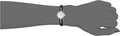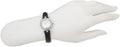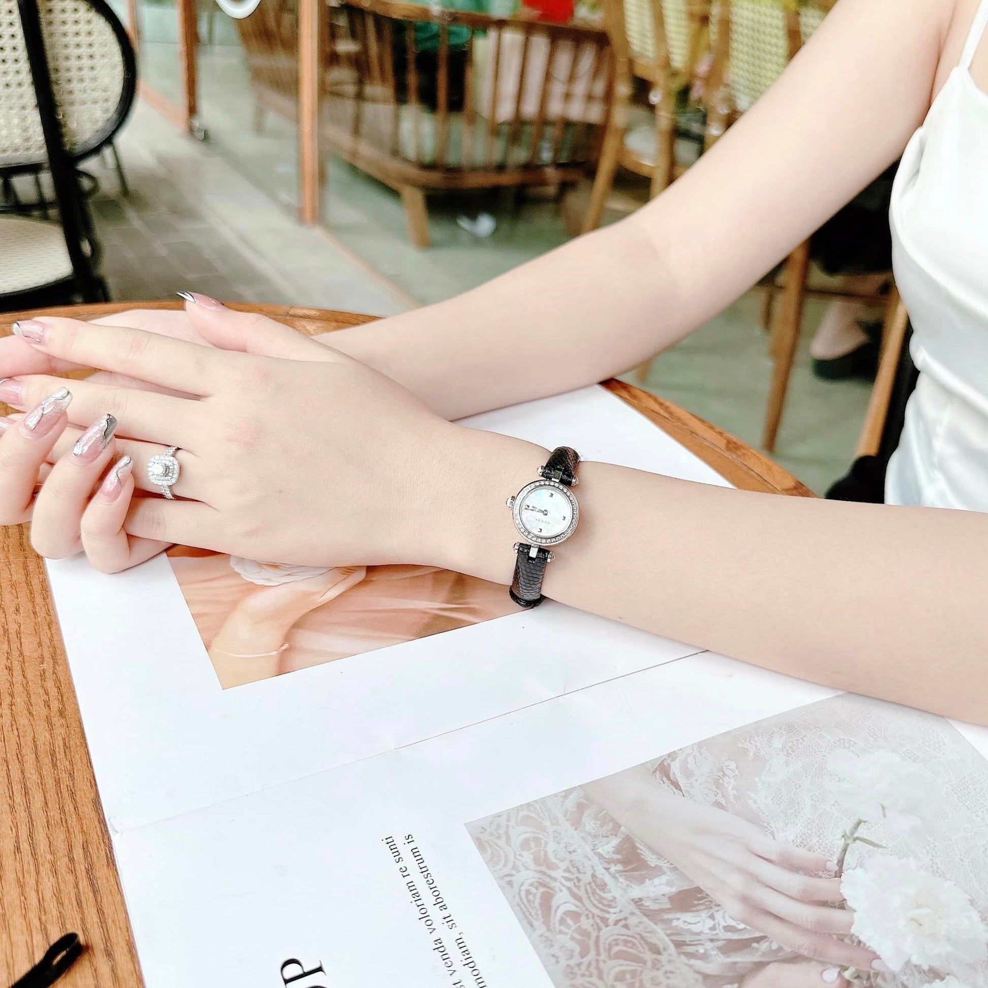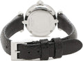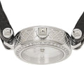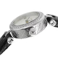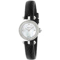 Stainless steel case with a black (lizard) leather strap. Fixed stainless steel bezel set with diamonds. White mother of pearl dial with silver-tone hands. Pryamid markers at the 3, 6, 9 and 12 o'clock positions.