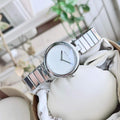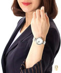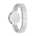 Stainless steel case with a stainless steel bracelet. Fixed stainless steel bezel. White diamante patterned dial with silver-tone hands. No markers. Dial Type: Analog. Quartz movement. Scratch resistant sapphire crystal. Pull / push crown. Solid case back. Case diameter: 32 mm.