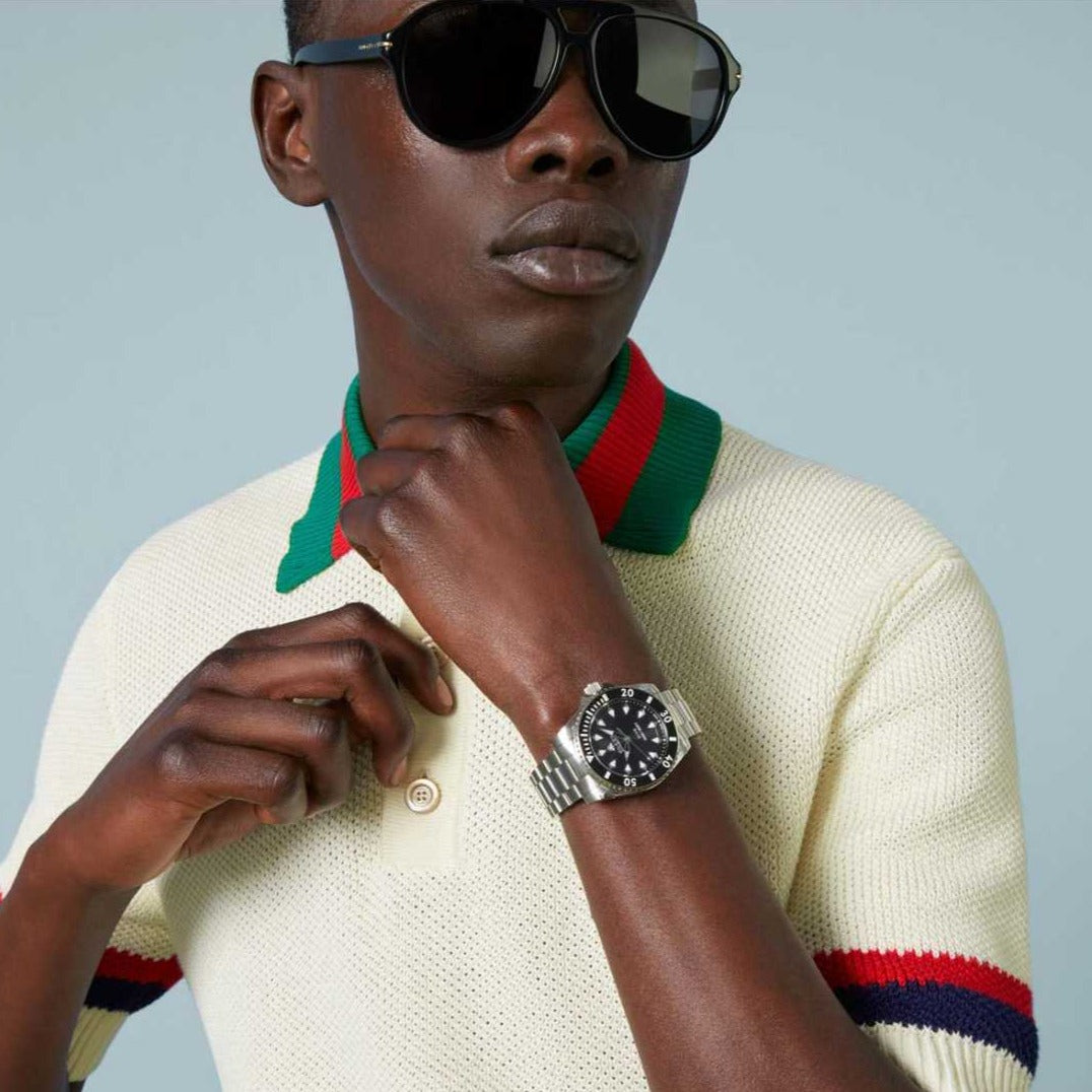 Marked by its diver's watch inspired design, here the Gucci Dive appears with a black dial with bee and a steel bracelet. Taking inspiration from the archives, the latest collection reimagine emblematic codes with a contemporary spirit.