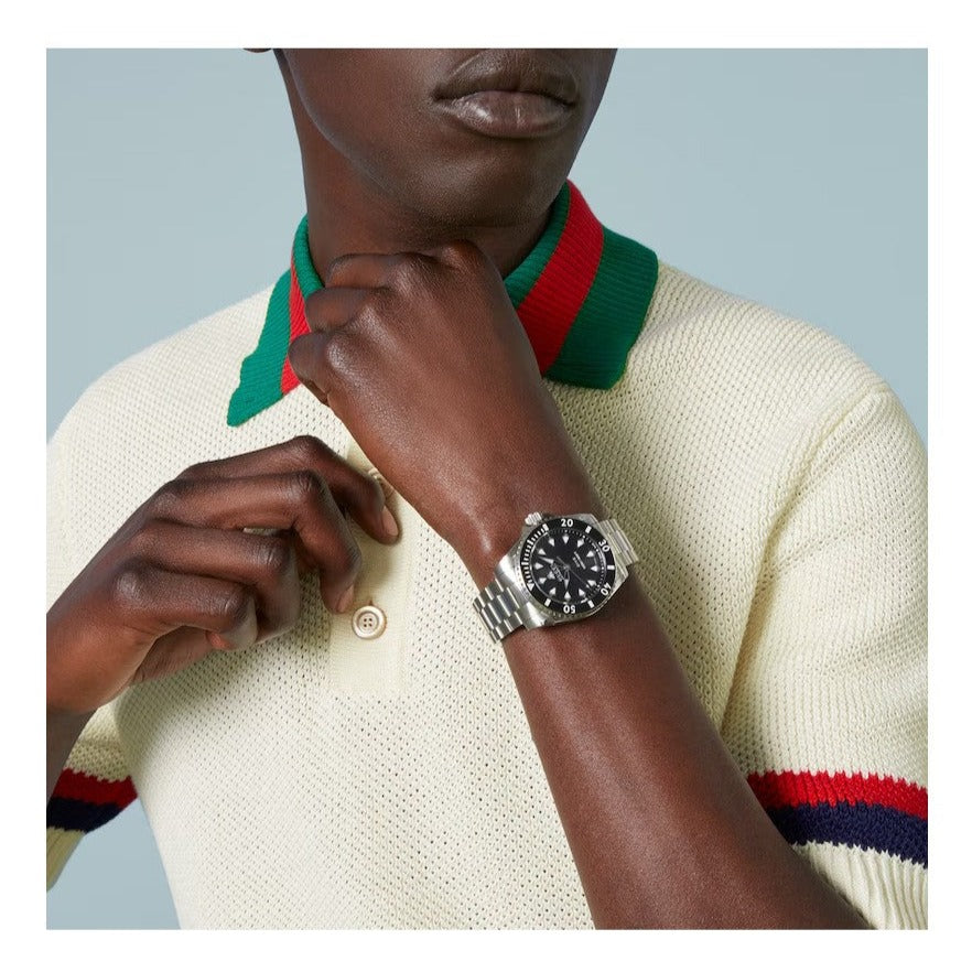 Distinguished by its diver's watch-inspired design, the Gucci Dive here features a black bee dial and steel bracelet. Taking inspiration from the archives, the latest collection reinvents emblematic codes with a contemporary spirit.