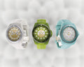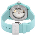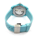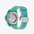 • 40mm steel and acquamarine bio-based plastic case, acquamarine transparent dial with multi icon indexes, bio-based acquamarine plastic strap