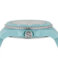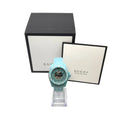Complete your summer look with this new dive watch from the Gucci Love Parade Collection. This stunning watch features an aquamarine dial as well as recycled steel for the case. The strap is composed of bio based plastics. This watch is powered by the swiss made SELLITA SW200 with automatic movement.