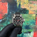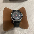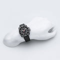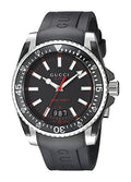 Stainless steel case with a black rubber strap. Uni-directional rotating stainless steel bezel with a black top ring. Black dial with luminous silver-tone hands and index / Arabic numeral hour markers. Minute markers around the outer rim. Dial Type: Analog. Luminescent hands and markers. Date display at the 6 o'clock position.