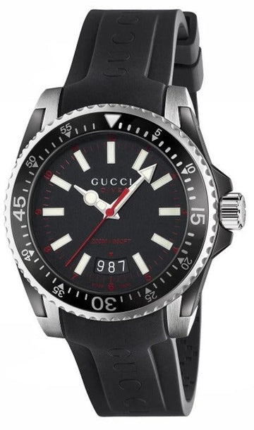 Quartz movement. Scratch resistant sapphire crystal. Pull / push crown. Solid case back. Case diameter: 40 mm. Case thickness: 11 mm. Round case shape. Band width: 20 mm. Deployment clasp with double push button release. Water resistant at 200 meters / 660 feet. Functions: date, hour, minute, second. Casual watch style. Gucci Dive Black Dial Black Rubber Men's Watch YA136303.
