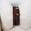 Gucci G Frame Yellow gold PVD stainless steel case with a red and green striped canvas strap. Fixed yellow gold PVD bezel. Red and green dial with yellow gold-tone hands. Pyramid markers at the 3, 6 and 9 o'clock positions. Dial Type: Analog. Quartz movement. Scratch resistant sapphire crystal. Square case shape. Case dimensions: 18 mm x 14 mm. Water resistant at 30 meters.