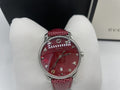 Stainless steel case with a cherry red (lizard) leather strap. Fixed stainless steel bezel. Cherry red mother of pearl dial with silver-tone hands and Gucci charms hour markers. Dial Type: Analog. Date display above the 6 o'clock position.