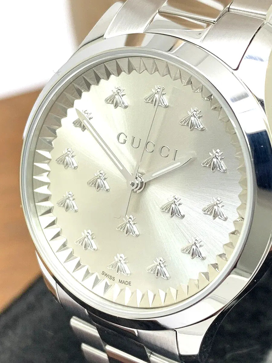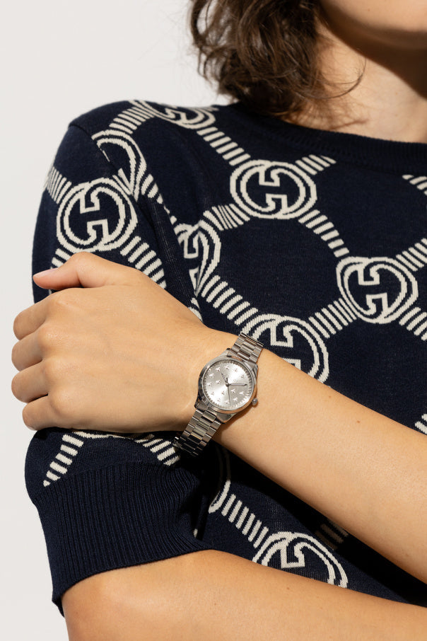 The Gucci bee, a historical symbol from the '70s archives, is combined with a sun brushed dial and steel bracelet. The G-Timeless collection combines classic design details with a contemporary aesthetic to create elevated watches with a timeless feel.