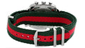 Silver-tone stainless steel case with a green/red/web nylon strap. Fixed silver-tone stainless steel bezel. Green/red dial with silver-tone hands. Tachymeter scale around the outer rim. Dial Type: Analog. Ronda Caliber quartz movement. Scratch resistant sapphire crystal. Solid case back.