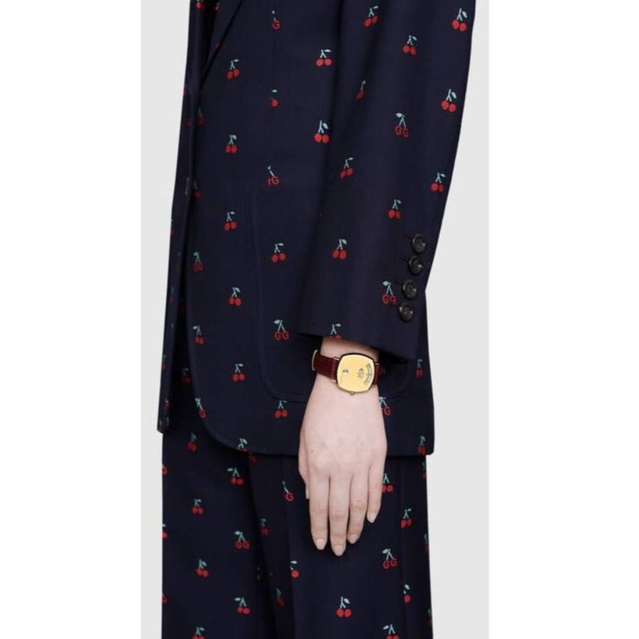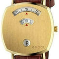 Gucci Grip Yellow Gold PVD Watch YA157402. A new addition to the Gucci family; Grip inspired by skaters of the late 70s. This range has been designed to Grip the attention, with a sleek, vintage and unique genderless design. This timepiece with a 35mm rounded square dial featuring three windows which indicate the hour, minute and date with GG engraving. Presented on a bordeaux leather strap. Powered by a Swiss quartz movement. Complete with a 2-year manufacturer guarantee and presented in branded Gucci packaging.