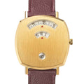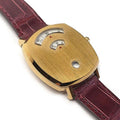 The yellow gold PVD face has three windows to display the hour, minute and date.
