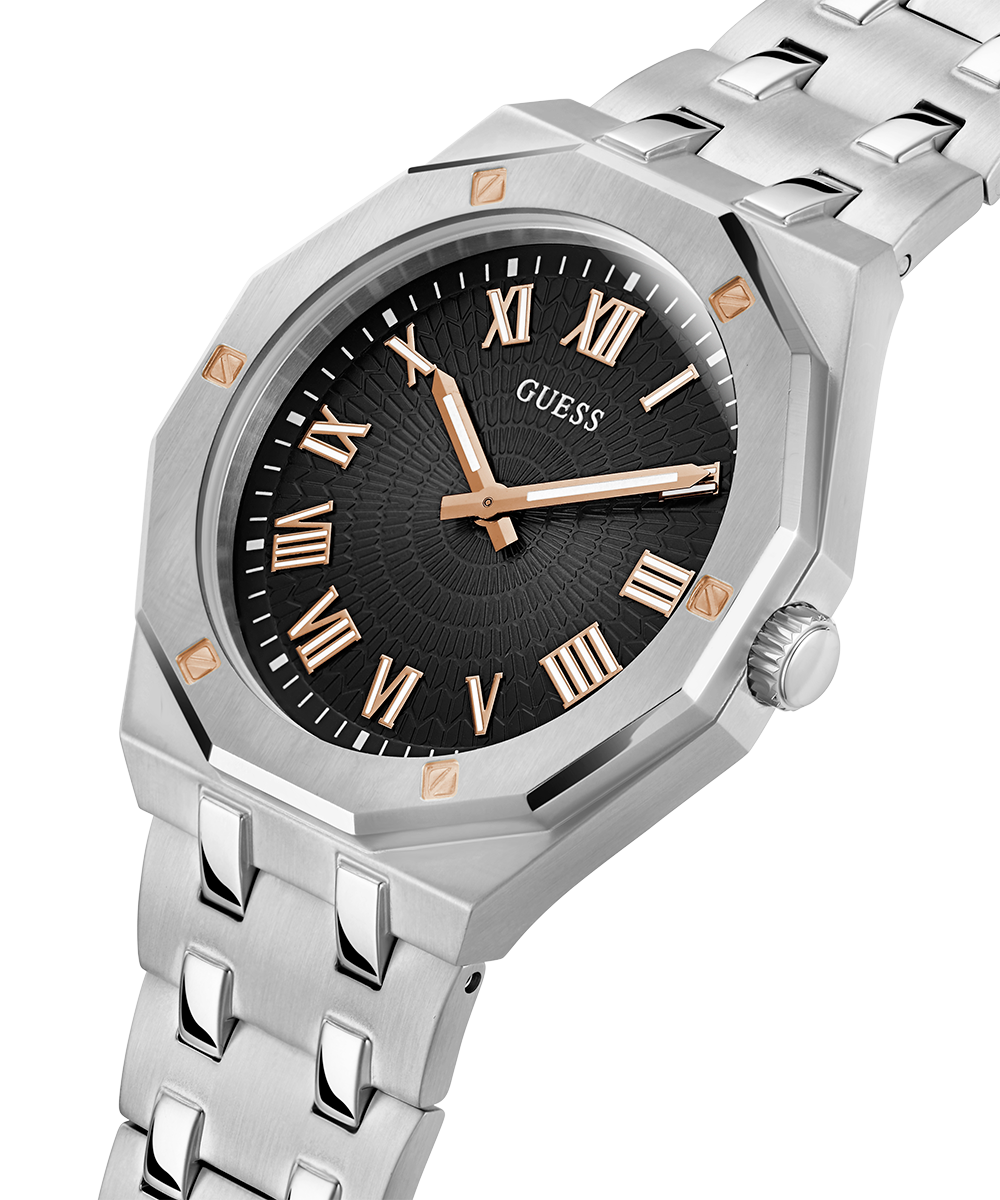 An asset to any man's wardrobe, this stunning octagonal case design with screw details features an upscale dial design with roman numerals and a brushed and polished bracelet. Men's practical watch Guess on a steel bracelet. Bracelet with a folding clasp, bracelet length 200 mm. 2-year warranty.