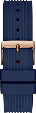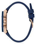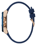 Sport meets Glam with this versatile chrono-look style featuring a rose-gold tone case with a blue nylon top ring on a blue silicone strap.