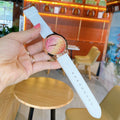 The crush timepiece from Guess features a rose gold plated stainless steel case. The case houses a glistening pink, yellow and orange bubble effect dial. The piece is finished with a contrasting soft white leather strap.