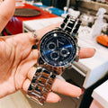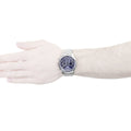A polished silver case and bracelet GUESS watch featuring a blue sunray chronograph dial.