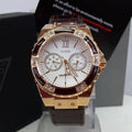 Stylish multifunctional women's watch GUESS W0775L14 from the Sport Steel fall 2018 collection, with a Japanese quartz movement. The watch case, with a diameter of 38 mm, is made of high quality steel with PVD coating in rose gold color. The bezel is brown and decorated with stones. The white analog dial is equipped with time indexes, Roman numerals and two mini-dials indicating the day of the week and date, respectively.