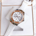Stainless steel case with a white silicone strap. Fixed rose gold-tone bezel set with crystals. White dial with luminous rose gold-tone hands and index hour markers. A Roman numeral appearts at the 12 o'clock position. Minute markers around the outer rim. Dial Type: Analog. Luminescent hands and markers.