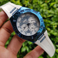 Classy & eye catching yet not over the top. Featuring modern designs to fit in with the "in crowd" GUESS delivers this stunning timepiece in a Blue IP plated stainless steel case, utilising quality quartz movement and a mineral crystal glass face for scratch resistance. A smooth White silicone band. A glitz Crystal bezel and dial completes the look.