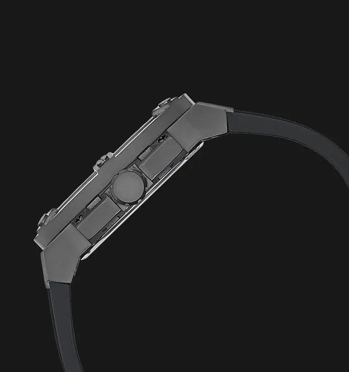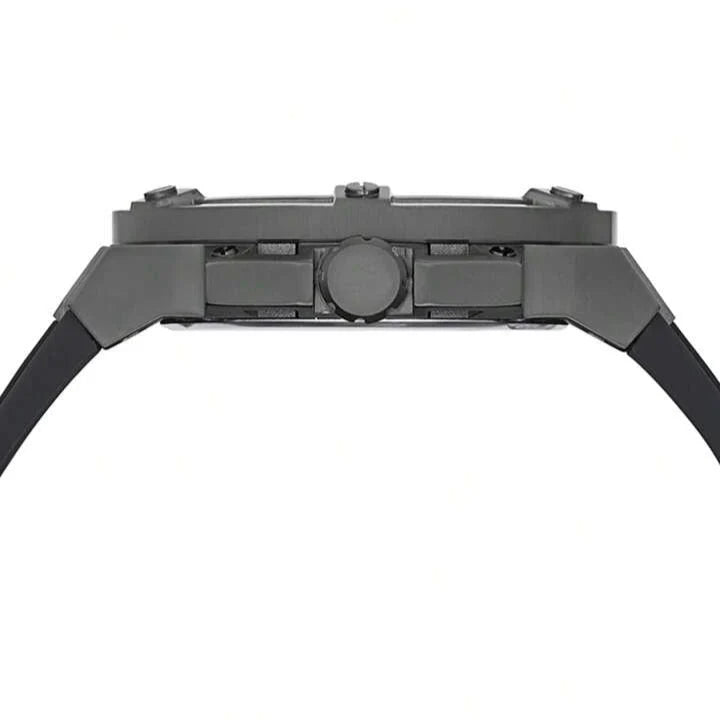 Matrix like patterns create a unique dial with cut thru details surrounded by a cut thru bezel and pushers and paired on silicone for whatever adventure awaits