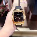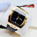 Black 27mm leather & silicone flex strap fits up to 7.75-inch wrist circumference Black sunray dial & gold-tone hands with two diamond markers Gold-tone 43mm tonneau stainless steel case Mineral glass crystal Water resistant to 50 meters (165 feet): In general, suitable for short periods of recreational swimming, but not diving or snorkeling