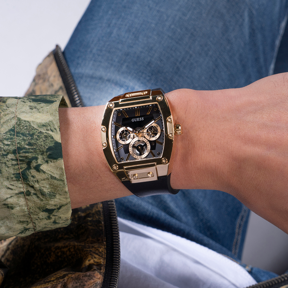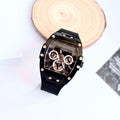 Skeleton dial details keep this phoenix on the rise. This style features a nylon barrel shaped case with rose gold screw details and a black multi-function dial and rose gold accents paired with a black silicone strap.