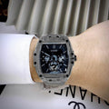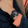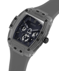 Skeleton dial details keep this phoenix on the rise. This style features a nylon barrel shaped case with black screw details and a black multi-function dial paired with a translucent silicone strap.