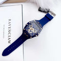 Skeleton dial details keep this phoenix on the rise. This style features a nylon barrel shaped case with rose gold screw details and a blue multi-function dial and rose gold accents paired with a blue silicone strap.