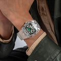 The appearance of this watch is bold and robust, with a look that combines elegance and modernity. Its resin case and bracelet provide a sense of durability and quality. With a diameter of 43 mm and a thickness of 11 mm, it comfortably fits on the wrist without sacrificing its presence.