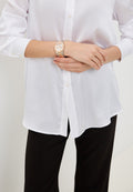 The GW0616L3 Women's Analog Watch is a classic choice. This round 36mm watch boasts a silver dial and a stainless steel case. It operates on quartz movement and features a two-tone stainless steel strap with a pilot buckle clasp. With 3 ATM water resistance, it's suitable for casual occasions and weighs 110 grams. Crafted in the USA, this watch comes with a 2-year warranty.
