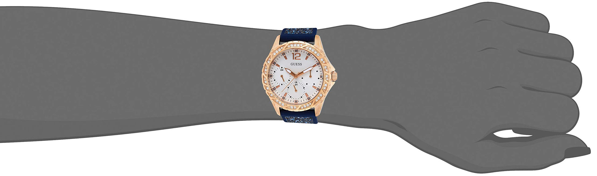 Rose gold-tone stainless steel case with a blue Silicone Strap /crystal encrusted Strap . Fixed rose gold-tone crystal set bezel. White dial with rose gold-tone hands and index and crystal hour markers. Minute markers around the outer rim. Dial Type: Analog. Luminescent hands. Three – day of the week, date and 24 hour subdials.