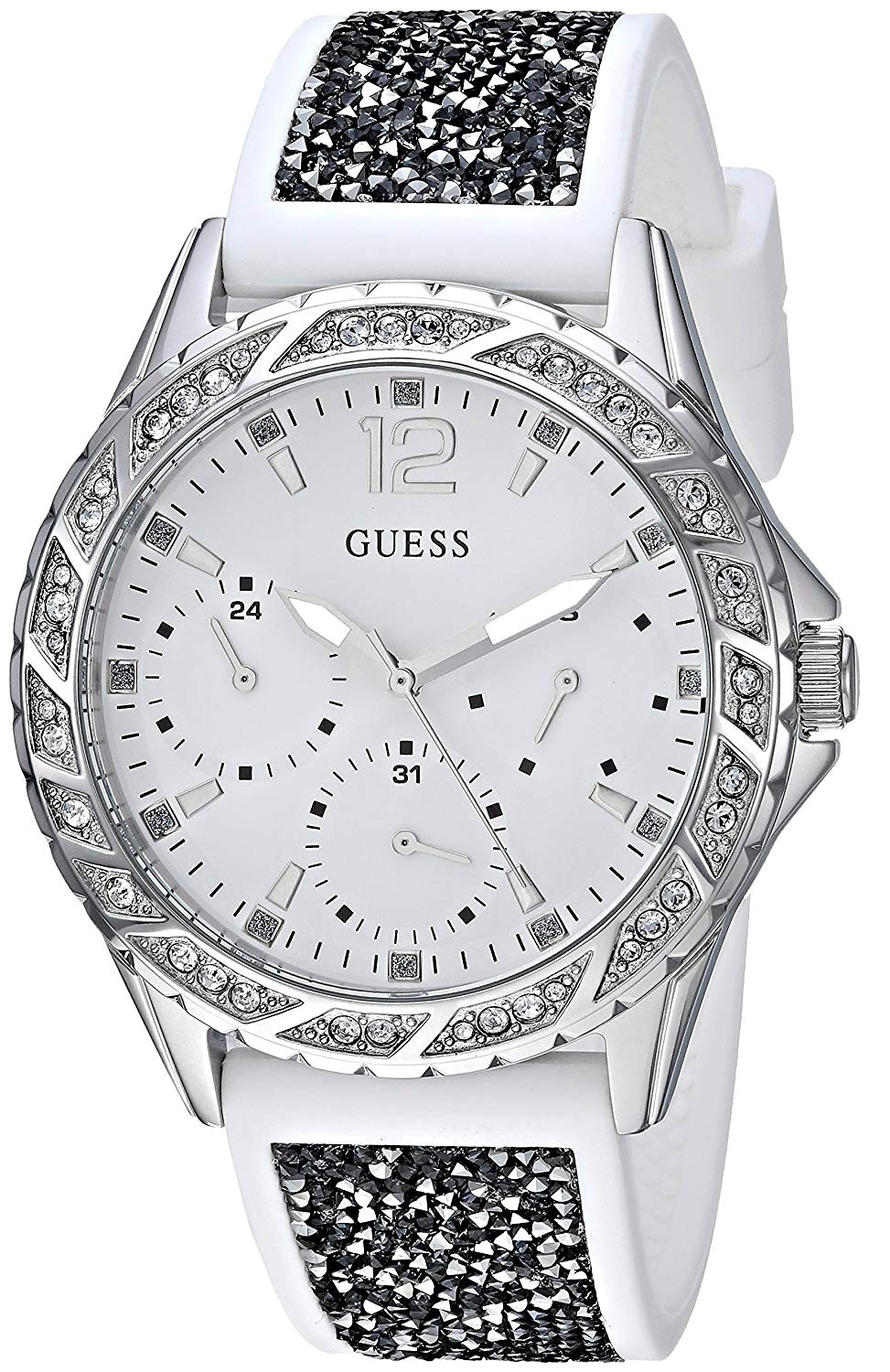 Give your everyday looks a modern upgrade with this powerful timepiece. Its bold design combines with essential functions to make it a watch you'll wear year after year. Guess womens watch. Silver stainless-steel case and black Silicone strap. White dial. Quartz movement. Buckle closure. Water resistance of 30 meters.