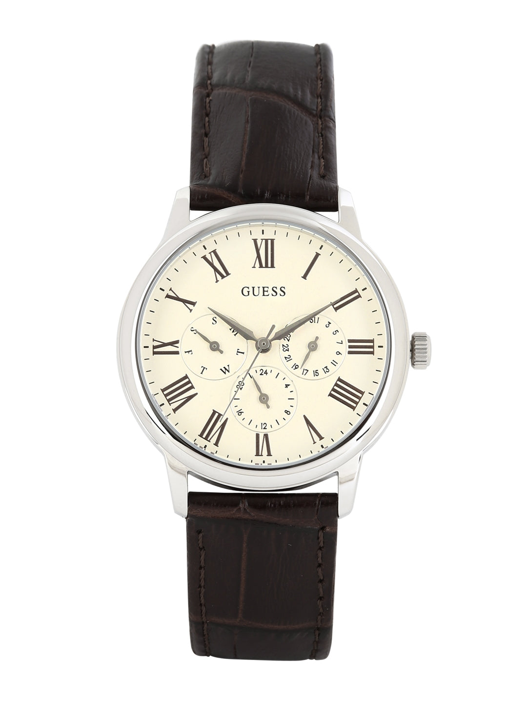 This gents Guess watch, features a stainless steel polished case with a white matte multi-function dial and a brown croco embossed genuine leather strap that fastens with a strap buckle. This watch is also powered by a quartz movement.