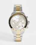 Hugo Boss ladies watch from the Novia collection. The movement of the watch is quartz. The watch case is made of two-tone silver and gold steel, 38 mm in diameter. The bracelet of the watch is made of two-tone silver and gold steel. The dial is gold in color. Water resistance is 5 ATM / 50 meters. Reference: 1502618
