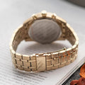 The gold stainless steel bracelet is composed of interlinked segments, adding to its cohesive look and is secured with a fold-over clasp. The watch hands are equipped with lume, ensuring they are visible in low-light conditions. With a water resistance of 5 ATM, this watch can handle splashes but is not suitable for swimming. The mineral glass protects the dial, maintaining clarity and safeguarding against everyday wear.