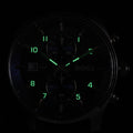 • This chronograph features a sleek blue dial with two sub-dials and a date aperture at 9 o’clock.