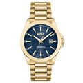 This classic timepiece operates with a quartz movement. The watch's blue dial contrasts beautifully with the gold tones of the case and bezel, creating a sophisticated look. The matching gold strap further enhances its cohesive design. Secured with a deployant clasp, the watch promises both security and comfort on the wrist. Crafted from 316L surgical steel, the watch case is designed for durability, with mineral glass protecting the dial from scratches. Luminous hands ensure visibility in low-light conditions, adding to its practicality.