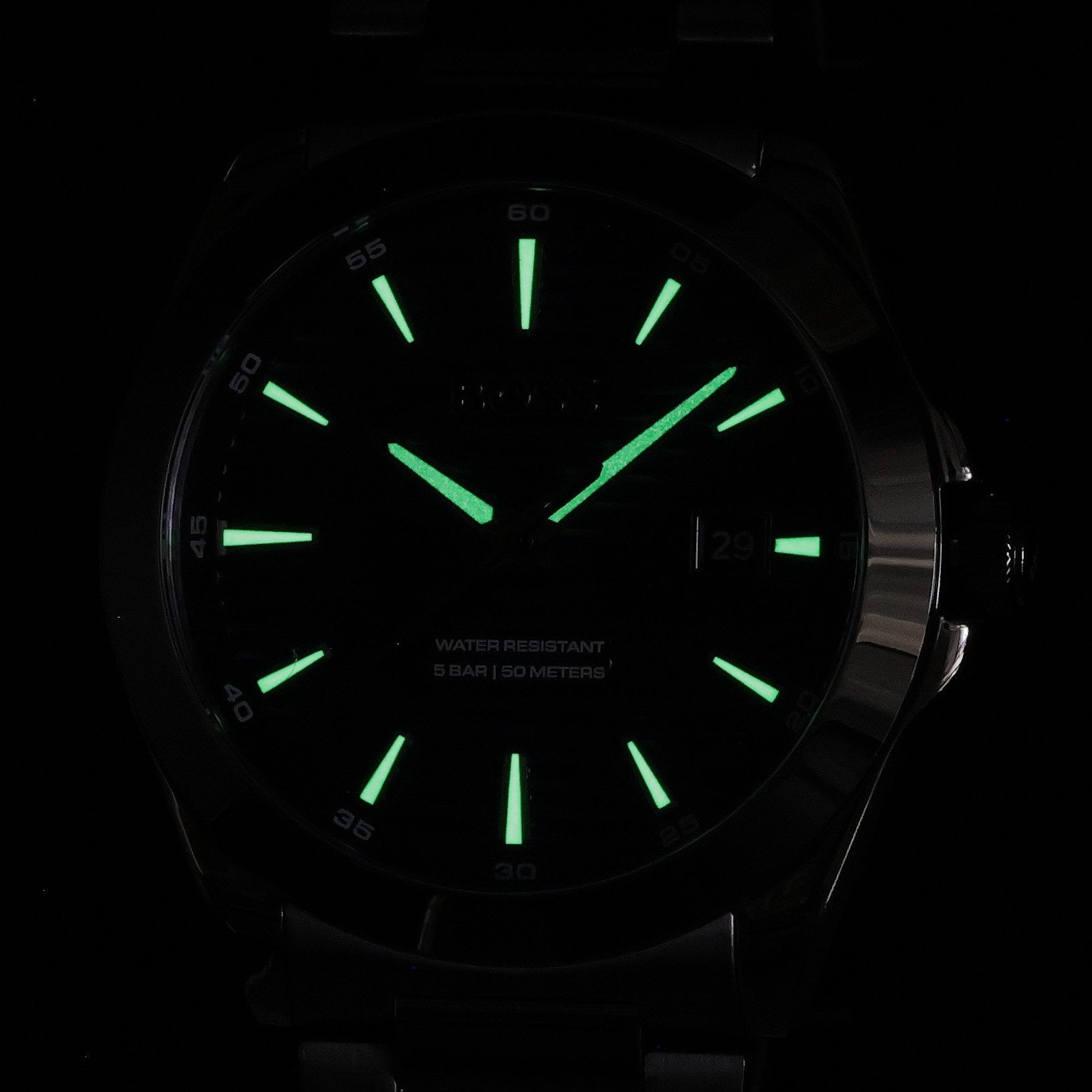This Hugo Boss watch has a 41mm stainless steel case and a stainless steel bracelet. The case houses a Seiko Instruments Inc. movement, and the watch features a mineral crystal.