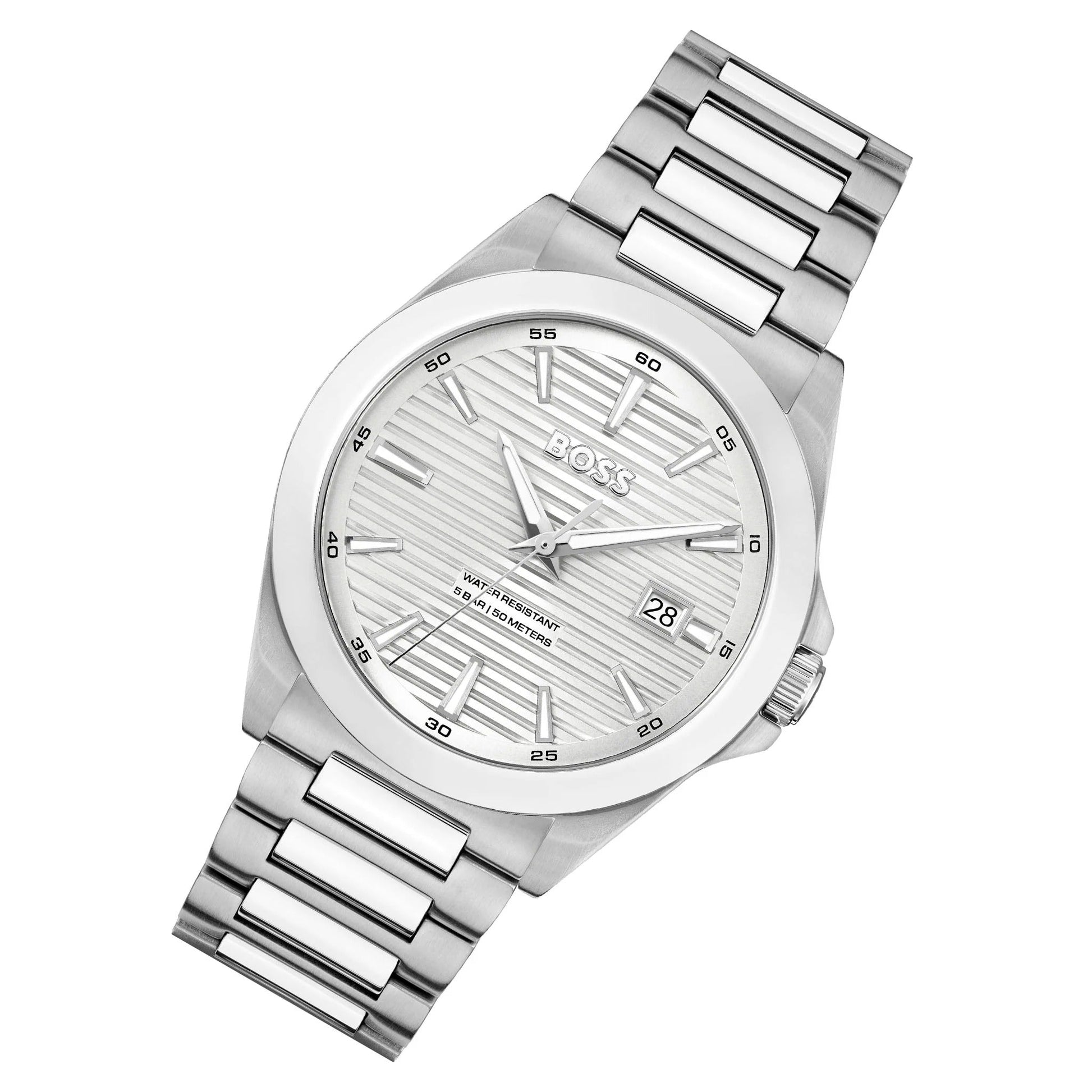 The Hugo Boss Strike 1514176 watch combines sleek design with practical features, perfect for the modern individual. Its silver stainless steel case and bracelet offer a polished and durable exterior. The dial features a subtle silver pattern and silver accents, adding a touch of sophistication while ensuring readability. Powered by precise quartz movement, it provides reliable timekeeping, complemented by a convenient date display function. With water resistance up to 50 meters, this timepiece is suitable for everyday wear, offering both style and resilience in various settings. - Quartz - Stainless Steel Case and Bracelet - Date Display - 50 Meters Water Resistant