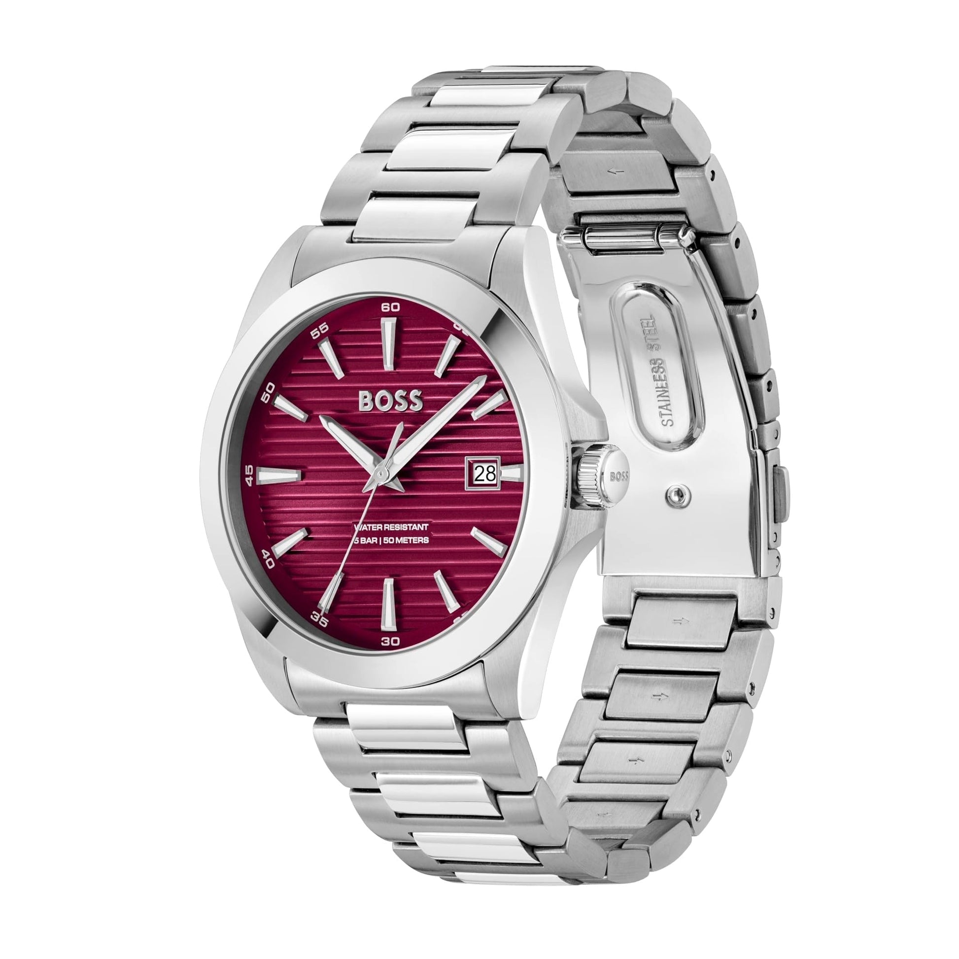 Boss men's watch from the Strike collection. The case diameter is 41 mm and is silver in color. The case is made of 316L stainless steel and the strap is made of silver-colored stainless steel. The dial is red and the case shape is round. The movement is 3h with date. The water resistance is 5 ATM. The display is analog. The reference is: 1514174