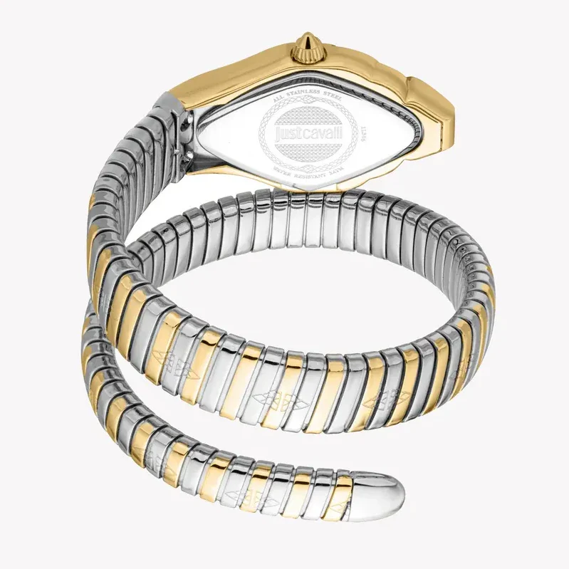 Presenting the Just Cavalli Women's Watch, a remarkable fusion of chic design and exceptional accuracy. This stunning timepiece is more than mere utility; it’s a bold expression of your individuality. Featuring a captivating Two-Tone Silver & Gold Stainless Steel Band, along with an Asymmetrical Gold Stainless Steel Case sized at 22 x 36.5 mm, this watch captures the essence of avant-garde sophistication. The radiant White Mother of Pearls Dial adds a layer of charm, ensuring it stands out in any setting.