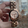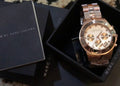 Rose gold-tone stainless steel case and bracelet. Fixed rose gold-tone bezel. Rose gold dial with rose gold-tone hands and Swarovski crystal hour markers. Dial Type: Analog. Date display appears between the 4 and 5 o'clock positions. Chronograph - three sub-dials displaying: 60 second, 60 minute and 24 hour. Quartz movement. Scratch resistant mineral crystal. Pull / push crown.