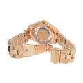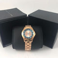 Rose gold-tone stainless steel case. Rose gold-tone stainless steel bracelet. Skeleton dial with rose gold-tone center. Quartz movement. Water resistant 50 meters. Case 34mm.