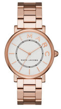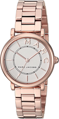 Rose gold-tone stainless steel case with a rose gold-tone stainless steel bracelet. Fixed rose gold-tone stainless steel bezel. Silver dial with rose gold-tone hands and index hour markers. Dial Type: Analog. Quartz movement. Scratch resistant mineral crystal. Pull / push crown. Solid case back. Case size: 36 mm. Round case shape. Water resistant at 50 meters / 165 feet. Functions: hour, minute, second. Dress watch style. Marc Jacobs Roxy Silver Dial Ladies Rose Gold Tone Watch MJ3523.