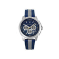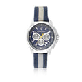 • Bracelet: Blue and grey fabric strap with stainless steel buckle
