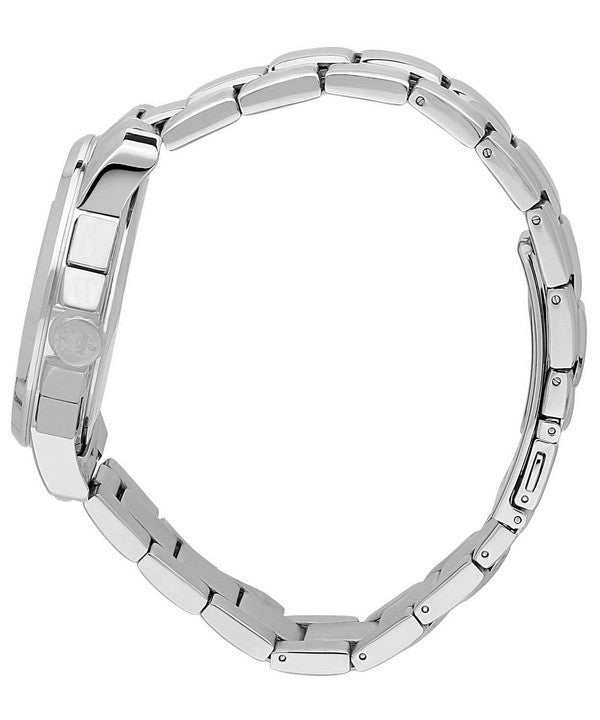 Black dial enhanced by luminous silver-tone hands. Silver-tone stainless steel case with a silver-tone stainless steel band. Quartz movement. 50 meters / 165 feet water resistance. Fixed bezel. Scratch Resistant Mineral crystal. Solid caseback. Fold Over with Push Button Release clasp. Pull / Push crown. Case size 44 mm x 11 mm. Band 20 mm x long. Maserati R8873621009 Successo Watch.