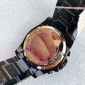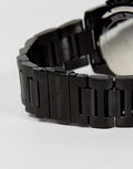 Black ion-plated stainless steel case and bracelet. Fixed black ion-plated bezel. Black dial with black hands and Roman numeral hour markers. Minute markers around the outer rim. Dial Type: Analog. Date display between the 4 and 5 o'clock positions. Chronograph - three sub-dials displaying: 60 second, 60 minute and 24 hours. Quartz movement. Scratch resistant mineral crystal. Pull / push crown.