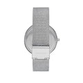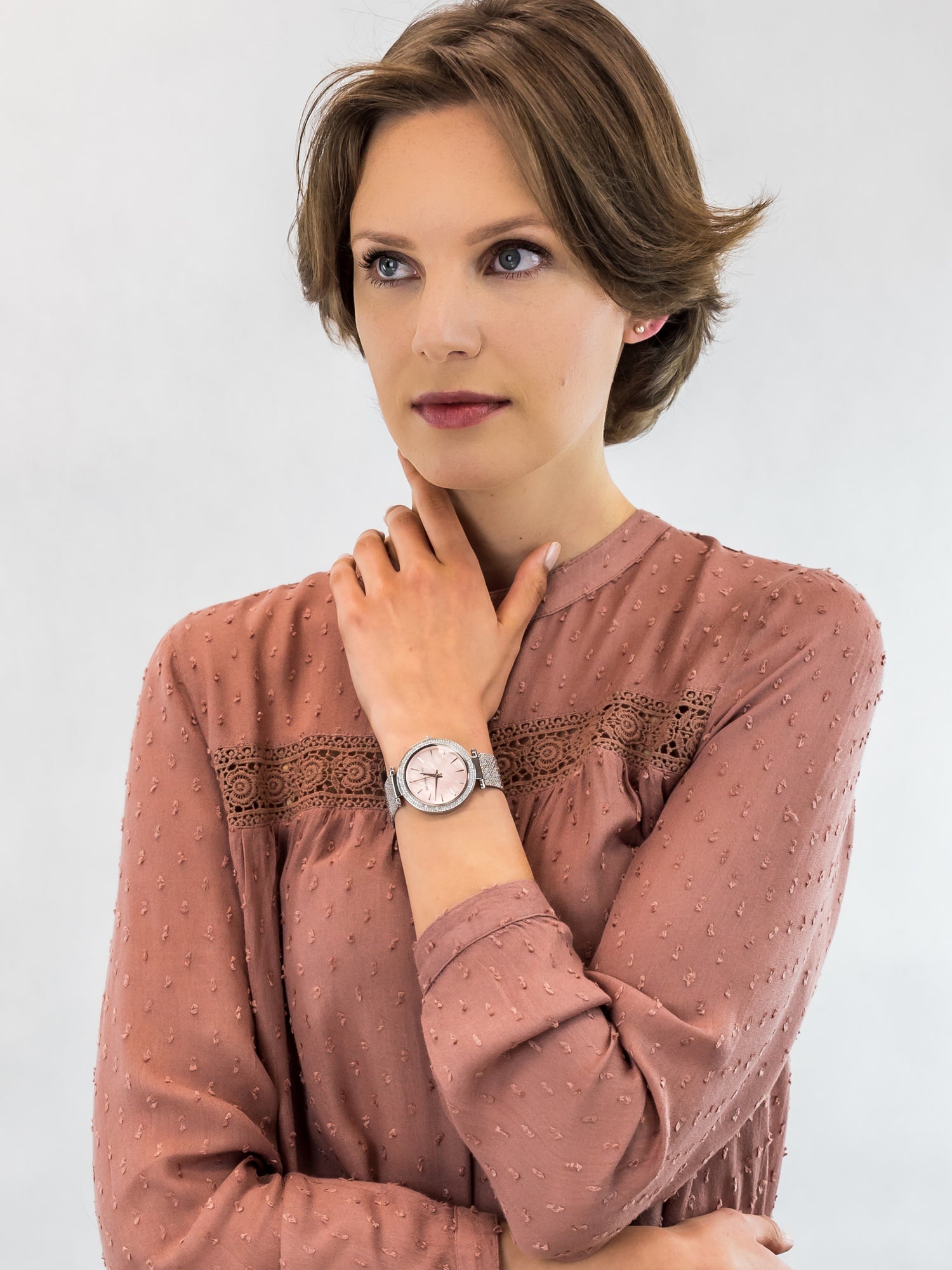 Stainless steel case with a stainless steel mesh bracelet. Fixed stainless steel bezel set with crystals. Pink mother of pearl dial with silver-tone hands and index hour markers. Dial Type: Analog. Quartz movement. Scratch resistant mineral crystal. Pull / push crown. Solid case back. Round case shape.