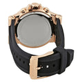 Rose gold-tone stainless steel case with a black rubber strap. Fixed- crystal set bezel. Black dial with rose gold-tone hands and index-Arabic at the 12 o' clock hour markers. Dial Type: Analog. Date display at the 6 o'clock position. Chronograph - three sub-dials displaying: 60 second, 30 minute and 24 hours.