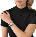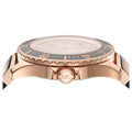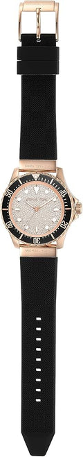 Upgrade your accessory collection with this women's analog watch from Michael Kors. The rose gold round dial is protected by a mineral glass. Michael Kors' 43mm Everest watch features a rose gold pave dial, three-hand and black silicone strap. Besides, it is completed with a buckle clasp to ensure a secure fit on the wrist.