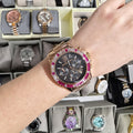 The enchanting Everest MK6972 women's wristwatch by Michael Kors combines a 42mm round rose gold-tone stainless steel case with a transparent and dark berry baguette bezel and a rose gold-tone stainless steel bracelet with a push-button clasp. It has a black dial with a chronograph display and a date window, which is protected under a mineral crystal glass and attractive white and pink stones on the crown. The unique look attracts ladies, and the quartz mechanism and quality make this watch a favorite accessory for everyday wear.
