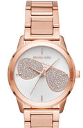 Sleek and chic, the Michael Kors Hartman watch features a silver sunray dial with glamorous pave crystal-studded aviators. A rose gold-tone case and H-link bracelet finish the jet-set look.